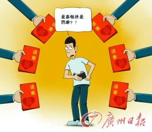 国庆和中秋双节就要到啦!可网友“上帝也难过”却犯愁了:大学刚毕业,年薪两万多。近段时间,先后收到了六份结婚请柬。有网友称“劫”日难过,雪片般飞来的结婚请柬则是“红色罚款单”。(9月20日《华西都市报》)
