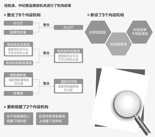 调整了机构。6个部门被整合,具体为:将办公厅、监察综合室整合为办公厅;党风政风监督室、执法和效能监督室整合为党风政风监督室;预防腐败室、外事局整合为国际合作局。3个部门新增设,具体为:2个纪检监察室,1个纪检监察干部监督室。2个部门重新组建,具体为:在干部室的基础上组建了组织部,在宣传教育室基础上组建了宣传部。