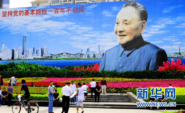 市民在深圳市深南大道旁的邓小平画像前广场上休闲。(资料图片 新华社发)