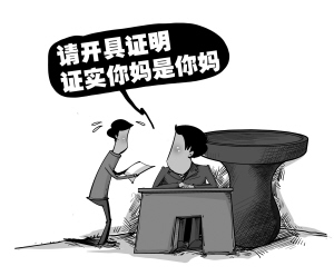 陈先生一家三口准备出境旅游,需要明确一位亲人为紧急联络人,于是他想到了自己的母亲。可问题来了:他需要提供他母亲是他母亲的书面证明。据了解,这样的奇葩“证明”不在少数。很多人在办事过程中遇到过类似令人啼笑皆非的证明:要证明你爸是你爸,要证明你没犯过罪,要证明你没结过婚,要证明你没有要过孩子,要证明你没买过房……(4月8日《人民日报》)