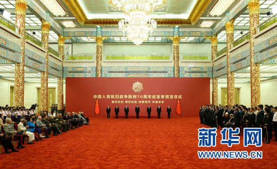 9月2日,中共中央总书记、国家主席、中央军委主席习近平在北京人民大会堂向30名抗战老战士老同志、抗战将领、为中国抗战胜利作出贡献的国际友人或其遗属代表颁发中国人民抗日战争胜利70周年纪念章并发表重要讲话。新华社记者庞兴雷摄