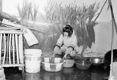 石林村村民杨梅芹用桶、盆接房顶漏下的雨水。