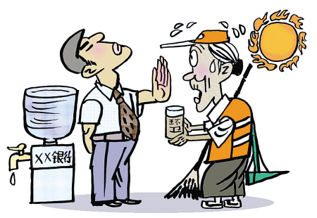 7月1日上午,浙江湖州市长兴县一名环卫工人,去当地一家农业银行讨水喝遭拒,并被银行职员拉出门外。此事引发了多方关注。7月6日农业银行长兴县支行专门开通微博回应此事称,已对银行当事人做出处罚,行长带队上门道歉得到环卫工陈女士的谅解。(7月8日《都市快报》)