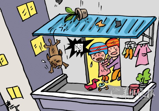 重庆市民李军先生居住于楼房,家中露天阳台上,常有垃圾从楼上抛下。为此,他特地安装了抗震防摔雨棚,为防不测,还定下特殊家规:到阳台须戴安全头盔,连亲友串门也不例外,否则,不准出入阳台。前日,竟有条狗从天而降,摔死其阳台上。李军称,得修改家规,以后家人出门到小区都要戴安全帽。(据《重庆晚报》)