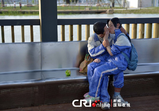 2013年5月24日,福建漳州碧湖生态园展出的中学生舌吻雕塑。