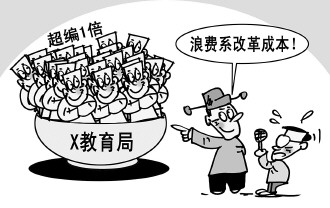 日前,湖北省武穴市教育局严重超编引起广泛关注。记者实地调查发现,该局核定编制54人,实际在岗75人,还有40人“退二线”,基本不用上班,超编一倍左右。武穴市教育局局长王卫平说:50岁的人退二线,的确是一种资源的浪费,“我当时就认为这也是改革的成本”(7月9日《京华时报》)。