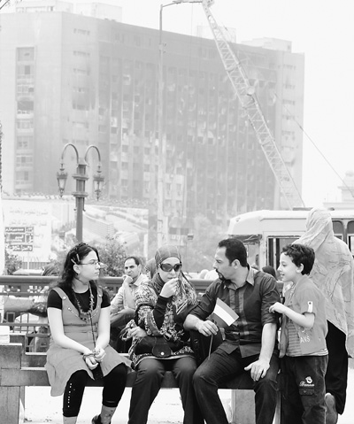 4月27日,一家埃及人在首都开罗市中心的解放广场上享受阳光。在他们身后不远处,是位于尼罗河畔的已被烧毁的前执政党总部大楼。