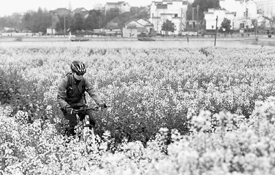 在江苏高淳,中国第一个“国际慢城”,人们可以在油菜花地里惬意地骑自行车。