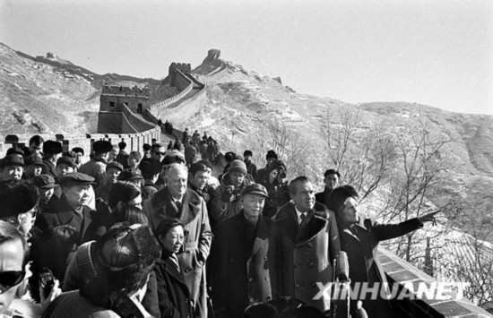 1972年2月24日,美国总统尼克松和夫人等游览长城。新华社发