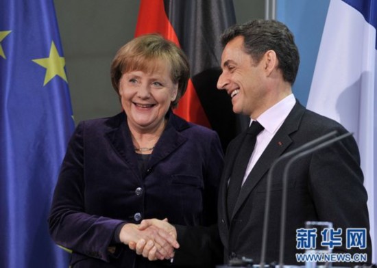 资料图片:1月9日,德国总理默克尔(左)和法国总统萨科齐在柏林出席新闻发布会。 新华社记者马宁摄