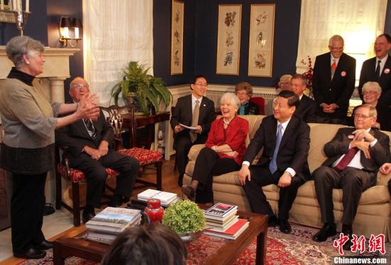 当地时间2月15日,中国国家副主席习近平到访艾奥瓦州马斯克廷市,并于27年前第一次访问此地时结识的老朋友举行茶叙。图为习近平与老朋友叙旧场景。中新社发