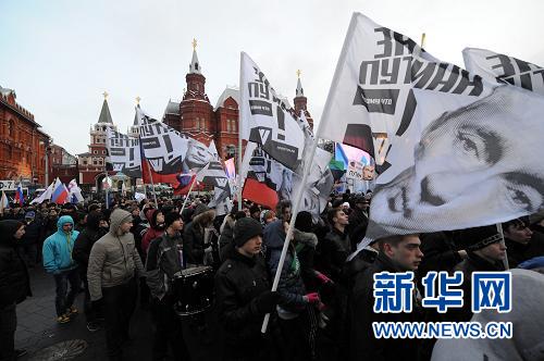 3月5日,普京支持者在庆祝活动中。新华社记者 李勇 摄