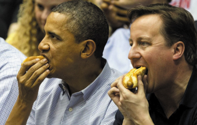 奥巴马同卡梅伦在俄亥俄州观看全美大学生篮球联赛决赛,两位领导人边看比赛边享用热狗。