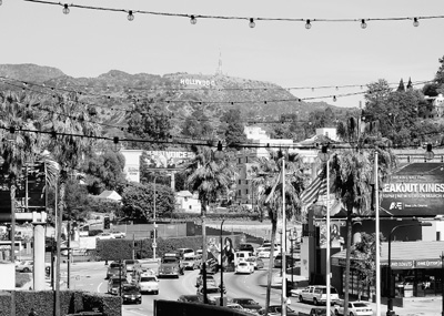 从奥斯卡奖的颁奖地好莱坞高地眺望远处山坡上的好莱坞标志。