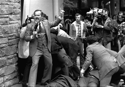 1981年3月30日,在里根总统遇刺倒地后,一名持枪特工大声发号施令。