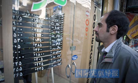 在美国严厉的制裁下,伊朗市场汇率频繁暴跌。图为2011年12月22日,在伊朗首都德黑兰,一名男子查看汇率牌。新华社