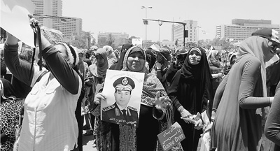 反对穆尔西的民众在解放广场手举国防部长塞西头像,兴高采烈。