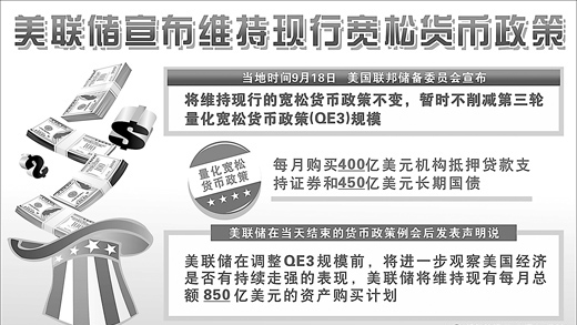 正当外界普遍预计本月起量化宽松政策将逐步收缩之际,美国联邦储备委员会9月18日在结束货币政策例会后宣布,将维持现行的宽松货币政策不变,暂时不削减第三轮量化宽松货币政策(QE3)规模。美联储称,在削减资产购买步伐前,需看到更多的证据显示经济和就业市场的改善是可持续的。