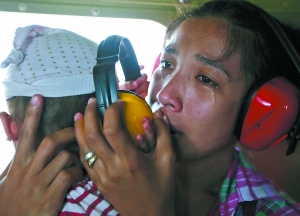 11日,吉万一名母亲在登上救援的直升机后激动落泪。