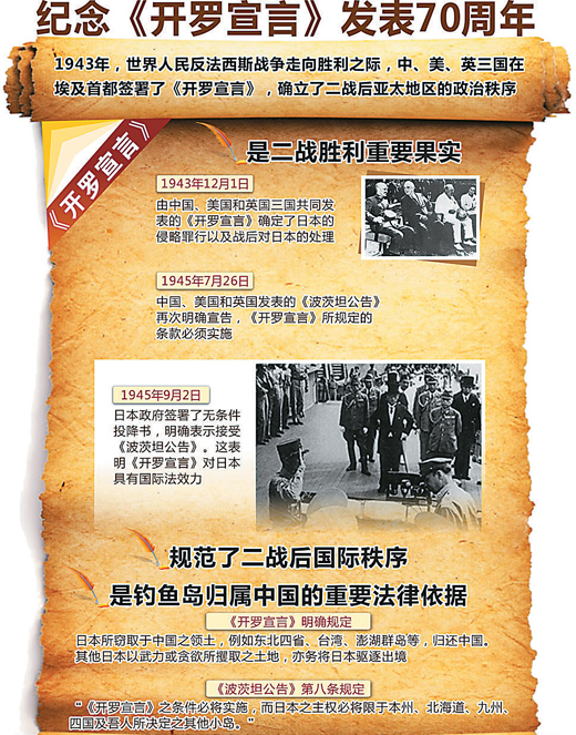 70年过去了,纪念《开罗宣言》的现实意义一点都不小于历史意义。《开罗宣言》不仅像一块“镇妖石”压在日本军国主义者身上和心上,而且像一面高悬在日本面前的“照妖镜”。