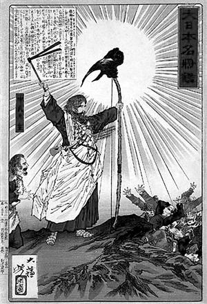这幅《神武天皇东征》是明治时期的浮世绘画师月岡芳年描绘《日本书纪》中神武东征的场面。画面中,神武天皇拿着巨大的弓,上面立着金鵄,在神的光辉照耀下,天皇击败了敌兵。此画于1876年刊行。