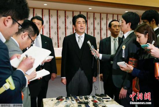 资料图:2013年12月26日,日本东京,日本首相安倍晋三在迎来12月26日执政一周年之际,参拜靖国神社。图为安倍晋三接受采访。