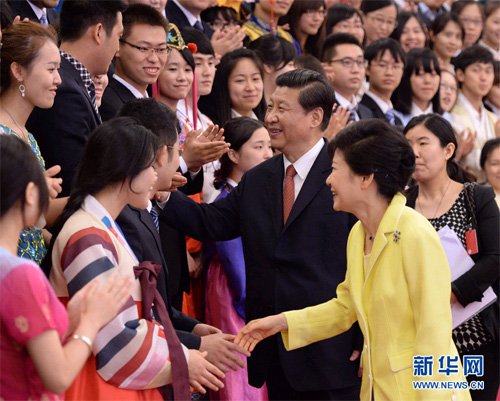 2013年6月27日,中国国家主席习近平在北京人民大会堂同韩国总统朴槿惠举行会谈。会谈后,习近平同朴槿惠共同会见中韩两国青年代表。