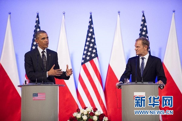 6月3日,美国总统奥巴马(左)同波兰总理图斯克(右)在华沙的波兰总理府共同出席记者会。奥巴马当天抵达华沙开始对波兰进行为期两天的访问。 新华社发