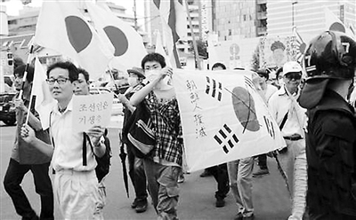 日本右翼团体也不甘落后。4月20日,日本右翼团体成员在东京市中心游行。游行中出现了被涂鸦破坏的太极旗,还在朴槿惠和慰安妇相片上写着“乞丐、卖淫女”。