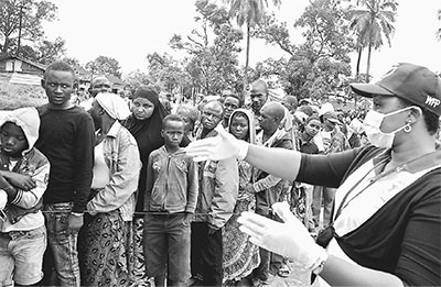 9月2日,在利比里亚首都蒙罗维亚以东60公里为控制埃博拉疫情而被隔离的小镇多洛,一名世界粮食计划署的工作人员正在协调当地居民排队领取分发的粮食。 新华社发