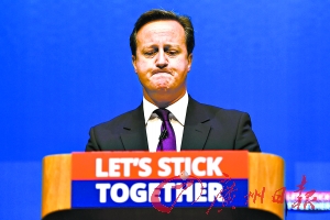 卡梅伦发表演讲,桌上牌子写着“让我们在一起”。