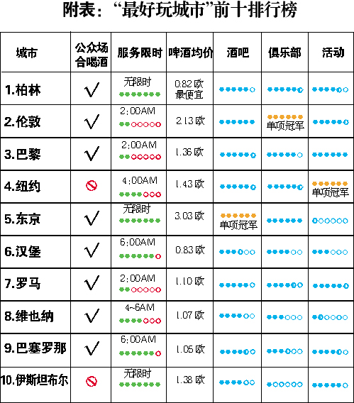 柏林因为便宜的啤酒和不限时的服务时间而获此殊荣,而伦敦则被公认拥有最棒的俱乐部和音乐会。