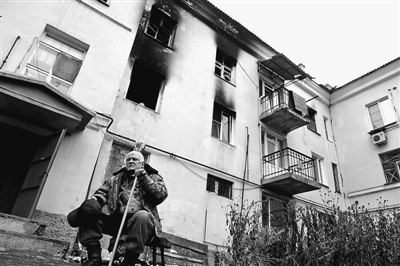 乌克兰危机爆发以来,乌东部地区民众生活受到严重影响。图为日前顿涅茨克的一名老人坐在被毁坏的建筑前企盼国家早日恢复和平。