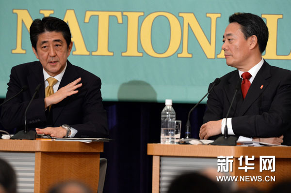 12月1日,在日本东京记者俱乐部,日本首相安倍晋三(左)在讨论会上阐述观点。新华社记者马平摄