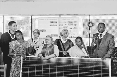 日前,在印度古吉拉特邦第一大城市艾哈迈达巴德,联合国秘书长特别代表云盖拉(右一)将太阳能板赠送给印度自主就业妇女协会。人民视觉