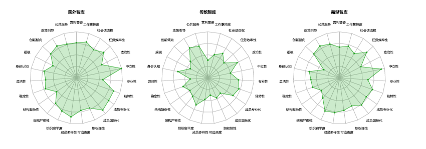 现代智库20世纪40年代出现,70年代后在国外形成行业,90年代后被视为公共事务决策中的重要一环。同时期中国的资政机构则经历了完全不同的发展轨迹。先是政府机关有专职的研究部门,后来又组建了政府机关之外专司研究的机构,同时教育机构也兼有研究职能。这三类机构在公共决策中都起到了重要作用且贡献良多。但为什么学者和专家反而将国外智库当成标杆?这个问题颇为复杂,简单粗暴地讲主要原因是:智库这个行业突然受到普遍关注,专家学者们在对比扮演智库角色的中国机构与国外智库时发现,国外智库具有一些中国的类似机构所不具有的优势。特别是国外智库中的佼佼者的表现令人叹为观止。事实上,很多学者专家口中的国外智库指的只是诸如兰德公司、卡耐基国际和平基金会、布鲁斯金学会这样的业中翘楚。我们有一个研究针对智库的组织内涵。研究方法是先从文献中找出多种组织特征,这些特征会偏向咨询研究类机构,但这个条件不是必须的,只要是组织的特征即可。我们共找出23个组织特征,并让专家分别给他心目中的国外智库、中国传统智库和中国新型智库打分,评分结果如下图所示。从组织特征轮廓上来看,中国新型智库与国外智库非常接近,与中国传统智库差别很大,而且中国新型智库在所有组织特征上的得分都要高于中国传统智库。