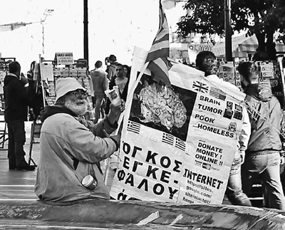 自债务危机爆发以来,希腊承诺实施以减薪、增税、裁员和私有化为主要内容的紧缩和改革政策。一系列的紧缩措施使民众生活受到严重影响,约1/4的家庭陷入贫困。图为今年1月希腊大选期间,在雅典市中心国会大厦前广场乞讨的老人。