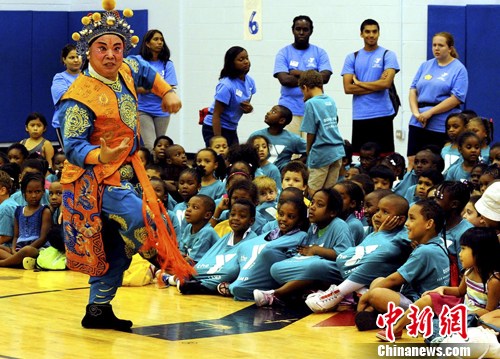 资料图片:纽约梨园社演员到纽约布碌仑学生夏令营演出京剧《扈家庄》选段,各族裔小观众欣赏演员的精彩演出。