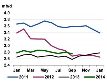 从产业结构上看,石油产业是伊朗的经济命脉,伊朗目前是世界四大石油生产国,OPEC第二大石油输出国。石油产业是伊朗外汇收入的主要来源,占到了伊朗外汇总收入的一半以上。然而,近几年的经济制裁使伊朗原油产量大幅下降(见图三),伊朗的经济也因此遭受沉重打击。除石油产业外,天然气、钢铁、汽车制造业、农业、电子工核工业等领域都是伊朗的重点产业。