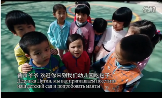 5分17秒的视频中,拍摄地点涉及了北京的莫斯科饭庄、俄罗斯驻华大使馆、俄罗斯商贸街、国际关系学院以及幼儿园等,受访人群也来自不同职业和年龄段,从幼儿园里的小朋友到骑自行车买菜的大爷,大家都从各自的视角回答了“提到俄罗斯你会想到什么”、“你眼中的普京”、“你想对普京说点啥”三个问题。
