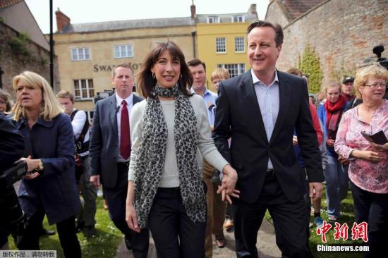 资料图:当地时间2015年5月4日,英国保守党领袖、英国首相卡梅伦携妻前往英格兰,为选举拉票。