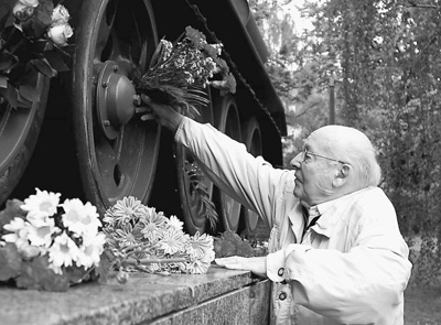 二战老兵韦尔纳向德俄博物馆的苏联红军坦克献花。