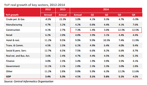 从产业结构来看,根据巴林2013年GDP构成,石油天然气行业占26.66%,金融业占15.14%,制造业占14.65%,建造业占5.88%,批发零售业占3.99%,宾馆餐饮业占2.13%,农渔业占0.27%。石油天然气行业作为其支柱性产业为巴林政府提供了主要收入,但不同于其他海湾国家,巴林早在20世纪70年代末起就开始着重发展金融业,目前已成为海湾地区的金融中心。值得注意的是,2014年以来建造业的发展速度迅速,2014年四个季度的增长速度分别为1.4%、3.6%、12.3%和12.5%,全年达到了7.3%的增速。(如图三)这主要是因为,巴林政府为刺激经济增长加大了基础设施和住房支出,并实施能源和工业方面的大型项目。