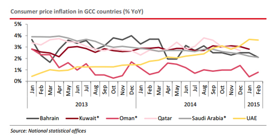 除此之外,巴林投资环境的一大优势在于商务成本低。巴林无营业税、个人所得税和增值税,普通商品关税在0—5%之间,货物进出口自由,不存在外汇限制,并且允许外国资本100%独资设立企业。巴林政府对生活必需品进行价格补贴,实行限价零售,且近年国内通货膨胀率较卡塔尔、阿联酋都要低(如图四),维持在较低水平波动。这使得巴林的商务成本低于迪拜、卡塔尔等周边市场。
