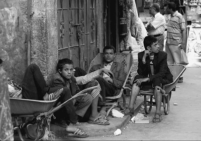 当地时间5月14日,也门进入5天人道主义停火,民众暂享平静生活。图为也门萨那一个市场里,一些年轻人在独轮车上休息。