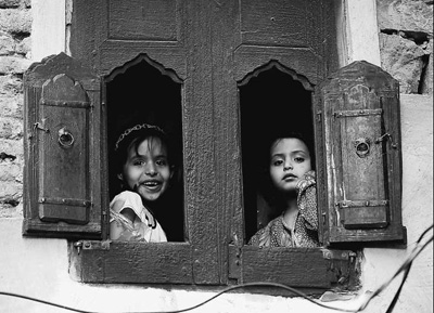 也门萨那两位女孩在窗台上展露笑颜。