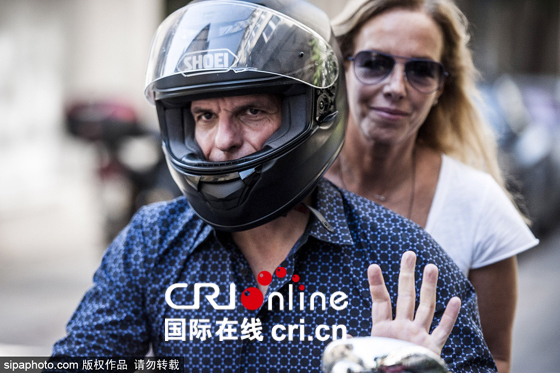 希腊财长瓦鲁法基斯骑摩托车载着妻子离开财政部。