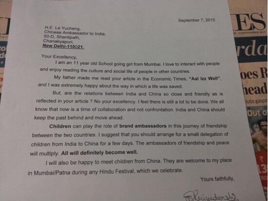 印度小女孩读到海外网文章后,写给中国驻印度大使乐玉成先生的信