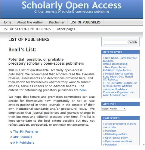 2009年开始,美国知名教授Jeffrey Beall涉足学术开放存取出版的问题研究,近年来不断更新开放存取期刊出版社的黑名单,提醒作者谨慎投稿和参与编辑或编委。2013年10月14日更新的黑名单包括439家期刊/出版社。