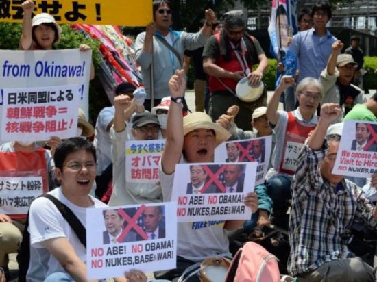 2016年5月27日,在日本广岛原子弹爆炸遗址前,市民在针对奥巴马访问的抗议活动中呼喊口号。新华社记者马平摄